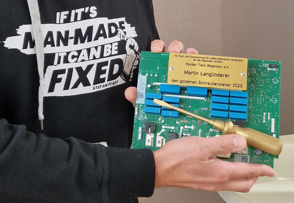 Am 15. Oktober 2025 fand im Rahmen des Netzwerktreffens des Runden Tisch Reparatur die feierliche Verleihung des Goldenen Schraubenziehers 2025 statt. In diesem Jahr ging der Preis an den Wirtschaftsingenieur, Gründer und Reparatur-pionier Martin Langlinderer aus Stuttgart.